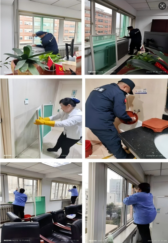 項目部周密部署,集中開展“擦亮窗口、潔凈辦公”深度清潔。針對20余間辦公室玻璃、窗框及窗紗,工作人員嚴(yán)格遵循“清塵、去污、提亮”標(biāo)準(zhǔn)化流程作業(yè),確保清潔效果達(dá)到無塵、無漬、無痕標(biāo)準(zhǔn)。煥然一新的辦公環(huán)境既掃去舊歲塵埃,更映照新春氣象。