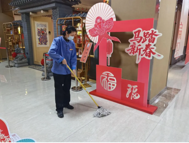 保潔團(tuán)隊(duì)始終扎根服務(wù)一線,科學(xué)加密清掃頻次,嚴(yán)格遵循標(biāo)準(zhǔn)化清潔作業(yè)流程,對(duì)展廳、走廊等重點(diǎn)區(qū)域每日開展4次全面清潔、2次專業(yè)消殺,及時(shí)清理垃圾雜物,實(shí)現(xiàn)場(chǎng)館地面無污漬、環(huán)境無雜物、空氣無異味的服務(wù)標(biāo)準(zhǔn)。他們以細(xì)致入微的作業(yè),守護(hù)著場(chǎng)館的整潔雅致,讓市民在清爽舒適的環(huán)境中邂逅齊魯文化之美,讓新春年味與筆墨書香在潔凈空間里交融共生。