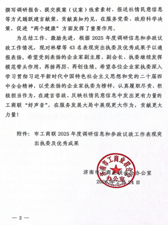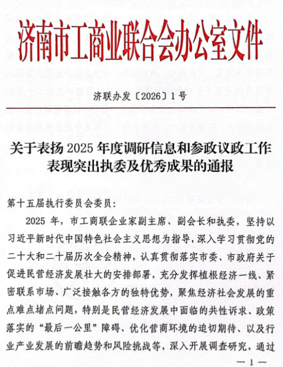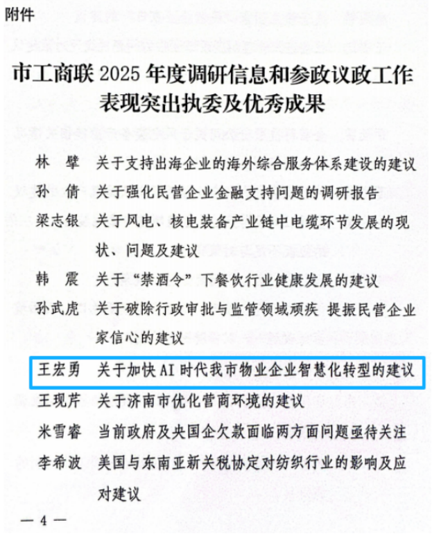2026年2月24日,濟南市工商聯(lián)頒布“2025年度調(diào)研信息和參政議政工作表現(xiàn)突出執(zhí)委及優(yōu)秀成果”,濟南連心物業(yè)有限公司董事長王宏勇等43名執(zhí)委獲評表現(xiàn)突出執(zhí)委,他撰寫的《關(guān)于加快AI時代我市物業(yè)企業(yè)智慧化轉(zhuǎn)型的建議》獲評優(yōu)秀成果。
