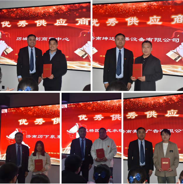 會(huì )議進(jìn)入頒獎環(huán)節,歷城世刻商貿中心、濟南坤達環(huán)保設備有限公司、濟南歷下泉東管道清理隊、天橋區得龍水暖器材經(jīng)銷(xiāo)部、濟南青龍廣告有限公司等5家供應商榮獲濟南連心物業(yè)有限公司“2023年度優(yōu)秀供應商”,并頒發(fā)“優(yōu)秀供應商服務(wù)單位”榮譽(yù)證書(shū)。