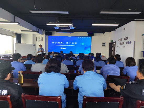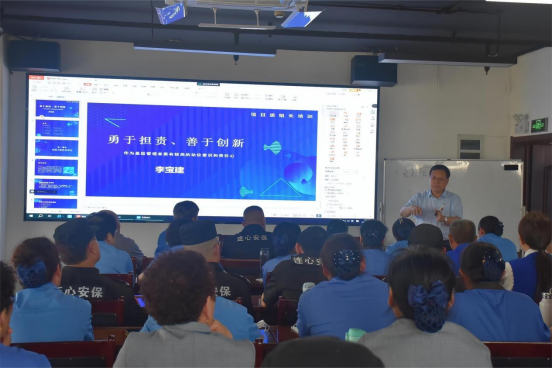 2024年5月11日下午,濟南連心物業(yè)有限公司舉辦2024年第二季度班組長(cháng)、工會(huì )組長(cháng)培訓,濟南連心物業(yè)有限公司工會(huì )主席李寶建以《勇于擔責、善于創(chuàng )新》為題,通過(guò)線(xiàn)上線(xiàn)下相結合培訓方式,為來(lái)自各項目65名班組長(cháng)進(jìn)行全面培訓。