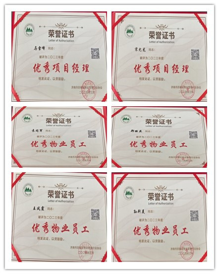 濟南連心物業(yè)有限公司榮獲“2023年度優(yōu)秀會(huì )長(cháng)單位”、馬雪峰、宋允龍獲“2023年度優(yōu)秀項目經(jīng)理”馬曉婷、鄭麗亞、袁同軍、孫荊美、王風(fēng)霞獲“2023年度優(yōu)秀員工”等榮譽(yù)稱(chēng)號。