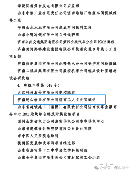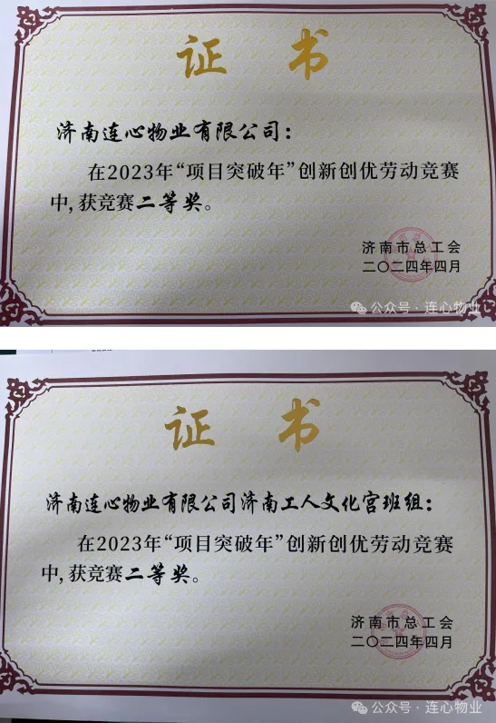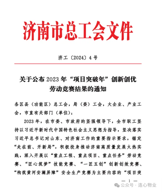 近日,濟南市總工會(huì )發(fā)布了關(guān)于公布2023年“項目突破年”創(chuàng )新創(chuàng )優(yōu)勞動(dòng)競賽結果的通知,公布了2023年 “項目突破年”創(chuàng )新創(chuàng )優(yōu)勞動(dòng)競賽獲獎的集體和個(gè)人名單,濟南連心物業(yè)有限公司和公司駐濟南工人文化宮班組均榮獲2023年“項目突破年”創(chuàng )新創(chuàng )優(yōu)勞動(dòng)競賽二等獎。