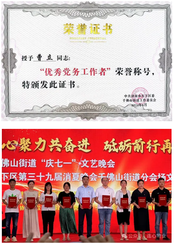 連心物業(yè)黨支部曹立榮獲千佛山街道“優(yōu)秀黨務(wù)工作者”榮譽(yù)稱(chēng)號