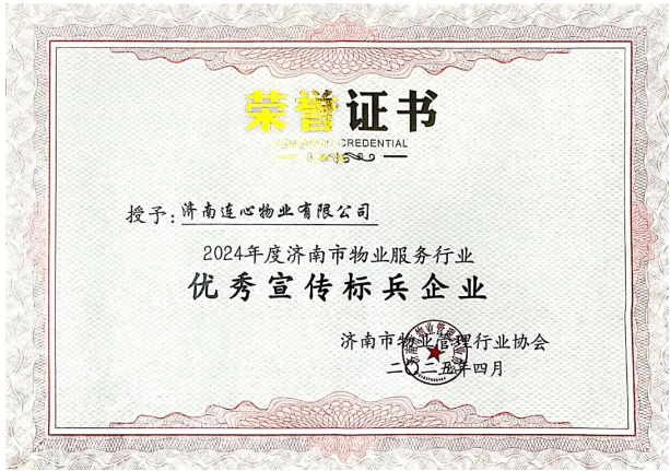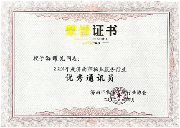 2025年4月25日下午,濟南市物業(yè)管理行業(yè)協(xié)會(huì )2024年度通訊員表彰大會(huì )在姚家街道姚家社區黨群服務(wù)中心召開(kāi)。濟南連心物業(yè)有限公司榮獲“優(yōu)秀宣傳標兵企業(yè)”、孫耀先榮獲“優(yōu)秀通訊員”榮譽(yù)稱(chēng)號。