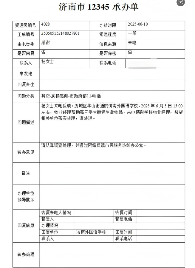2025年6月5日,濟南連心物業(yè)有限公司駐濟南外國語(yǔ)學(xué)校項目收到12345表?yè)P電話(huà),市民楊女士通過(guò)12345市民熱線(xiàn),對濟南連心物業(yè)公司駐濟南外國語(yǔ)學(xué)校項目物業(yè)經(jīng)理王金勇表達誠摯的感謝。