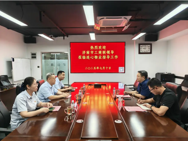 2025年7月10日上午,濟南市工商聯(lián)副主席、濟南流通行業(yè)協(xié)會(huì )會(huì )長(cháng)孫武虎,濟南共享經(jīng)濟商會(huì )會(huì )長(cháng)張猛蒞臨濟南連心物業(yè)有限公司進(jìn)行工作調研并指導工作。濟南連心物業(yè)有限公司黨支部書(shū)記、董事長(cháng)王宏勇,副書(shū)記、總經(jīng)理曹立,財務(wù)經(jīng)理馬曉婷參加調研接待工作。