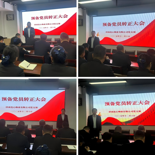2025年11月10日下午,濟(jì)南連心物業(yè)有限公司黨支部在1701會議室召開第四季度黨員大會,公司全體黨員、入黨積極分子及遞交入黨申請書人員48人參加本次大會。學(xué)習(xí)黨的二十屆四中全會精神、審議預(yù)備黨員轉(zhuǎn)正事宜等兩項議程。