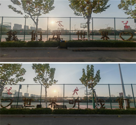 東籃球場圍欄上,保潔、綠化團(tuán)隊用棕褐落葉拼出“人文天下 精彩成長”的標(biāo)語,與球場活力相映;西籃球場“我們說世界,世界聽我們”字樣,則借落葉的自然質(zhì)感,傳遞出青春發(fā)聲的力量。路過師生們的每一聲美贊,都是對這份“藏在平凡里的溫?zé)帷弊钫鎿椿貞?yīng)。