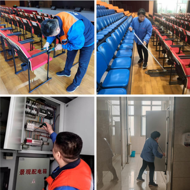 為確保戲劇節(jié)活動(dòng)場(chǎng)地及校園公共區(qū)域環(huán)境整潔有序,項(xiàng)目部提前部署工作。項(xiàng)目保潔團(tuán)隊(duì)對(duì)學(xué)校禮堂進(jìn)行全方位清潔,從座椅縫隙、地面污漬到舞臺(tái)周邊、玻璃門窗,逐一細(xì)致擦拭、拖掃,不放過(guò)任何衛(wèi)生死角,校園內(nèi)道路、宣傳欄等區(qū)域也同步開展深度保潔,保潔人員手持清掃工具對(duì)路面雜物、宣傳欄積塵進(jìn)行徹底清理,讓校園環(huán)境煥然一新。在設(shè)施保障方面,項(xiàng)目維修團(tuán)隊(duì)提前排查電路線路、檢修座椅穩(wěn)固性,對(duì)發(fā)現(xiàn)的細(xì)微故障及時(shí)處理,確?;顒?dòng)期間各類設(shè)施設(shè)備正常運(yùn)行,從硬件層面為戲劇節(jié)筑牢安全防線。項(xiàng)目會(huì)務(wù)服務(wù)人員全程跟進(jìn)保障工作。提前對(duì)主席臺(tái)進(jìn)行標(biāo)準(zhǔn)化布置,全面消毒清洗并精準(zhǔn)擺放茶具、飲用水等;活動(dòng)期間隨時(shí)待命,及時(shí)響應(yīng)會(huì)場(chǎng)各類服務(wù)需求,以貼心、規(guī)范會(huì)務(wù)服務(wù),為活動(dòng)順利開展提供有力支撐。