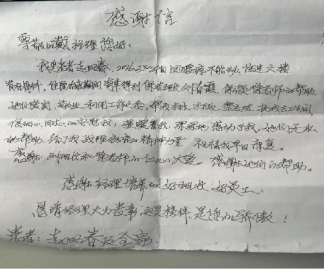 2026年4月1日,濟(jì)南連心物業(yè)駐山東電力中心醫(yī)院項(xiàng)目部收到患者趙鳳春手寫感謝信。信紙雖簡,字句卻滿載真誠,讓整個(gè)團(tuán)隊(duì)倍感溫暖。