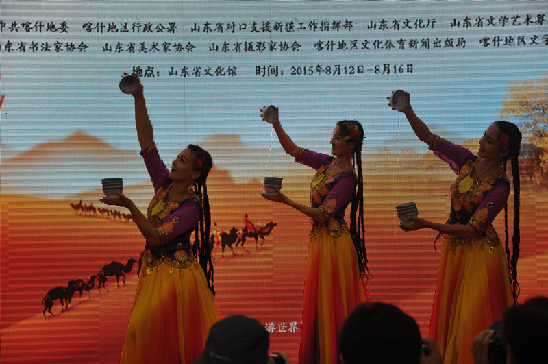 開(kāi)幕式上山東省委組織部副部長(cháng)王紅勇發(fā)表致辭。山東省省委常委、宣傳部長(cháng)孫守剛宣布:喀什文化齊魯行“絲綢重鎮 西部明珠”喀什風(fēng)情展開(kāi)幕。開(kāi)幕式上新疆喀什文化代表團表演了豐富多彩的歌舞表演和樂(lè )器表演。開(kāi)幕式后與會(huì )領(lǐng)導還參觀(guān)了印象喀什?喀什風(fēng)情攝影展、寫(xiě)意喀什?喀什風(fēng)情書(shū)畫(huà)展、工藝喀什?喀什風(fēng)情非遺展。下午在四層群星畫(huà)廊還組織了魯疆兩地書(shū)畫(huà)家交流筆會(huì )。