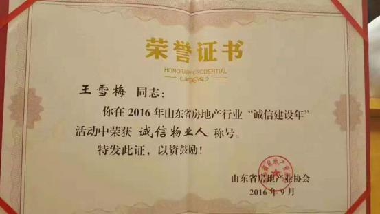 王雪梅同志獲“誠信物業(yè)人”稱(chēng)號