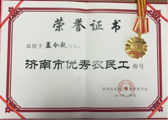 濟南連心物業(yè)有限公司孟令乾同志獲得“優(yōu)秀農民工”稱(chēng)號