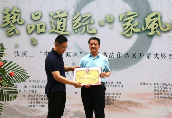 2017年6月10日10:30點(diǎn),“藝品道統·家風(fēng)傳承”張慶三“中華好家風(fēng)”主題書(shū)法作品展開(kāi)幕式暨慈善捐贈儀式,在濟南連心物業(yè)有限公司提供物業(yè)服務(wù)的星工坊園區的中國工業(yè)藝術(shù)館隆重舉行。山東大學(xué)書(shū)畫(huà)研究院院長(cháng)、著(zhù)名書(shū)法家王培元,濟南市委宣傳部原常務(wù)副部長(cháng)、中華文化促進(jìn)會(huì )會(huì )長(cháng)凌安中、中國致公黨山東省委一支部主委于溪,山東星工坊影視文化有限公司總經(jīng)理、中國工業(yè)藝術(shù)館館長(cháng)趙京橋等領(lǐng)導出席了開(kāi)幕式。