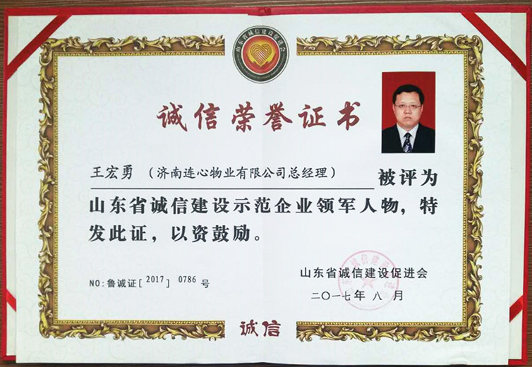 會(huì )議由山東省誠信建設促進(jìn)會(huì )秘書(shū)長(cháng)楊冬靜主持,會(huì )上通報表彰了濟南連心物業(yè)有限公司等65家全省第五批誠信建設示范企業(yè)、連心物業(yè)公司總經(jīng)理王宏勇等31名全省誠信建設示范企業(yè)領(lǐng)軍人物。這兩項榮譽(yù)的獲得是黨和政府對連心物業(yè)多年來(lái)誠信運營(yíng)給予的充分肯定與認可。