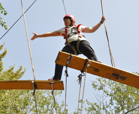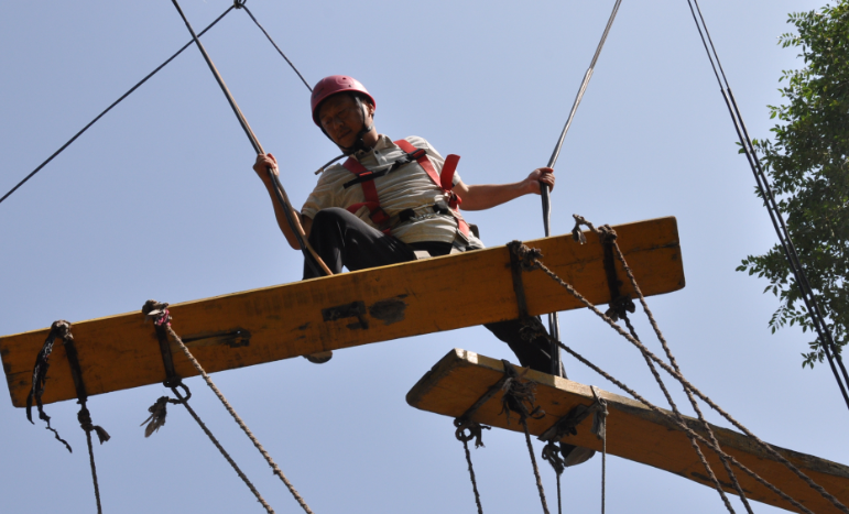接下來(lái)是一個(gè)挑戰難度更大的項目——“高空團隊橋”。挑戰者在8米高空,走過(guò)三塊遙晃不定的吊板,其他隊員抓住吊板垂下的繩子,掌握平衡,讓高空的學(xué)員順利通過(guò)??此坪?jiǎn)單,但是當站在高空木板橋上的一刻,大家的內心是起伏不定的,害怕和恐懼襲來(lái),邁出第一步十分艱難,但是看到大家緊緊抓住繩索以及聽(tīng)到隊友鼓勵的話(huà)語(yǔ),堅定了挑戰者邁出第一步的動(dòng)力。這不僅是對身體機能的挑戰、更是對心理承受能力的考驗。每位挑戰的隊員都充滿(mǎn)信心,因為我們有一個(gè)強有力的團隊在為我們作保障,在團隊力量的支持下,最后,33名隊員無(wú)一掉隊,全部在規定的時(shí)間內完成挑戰!