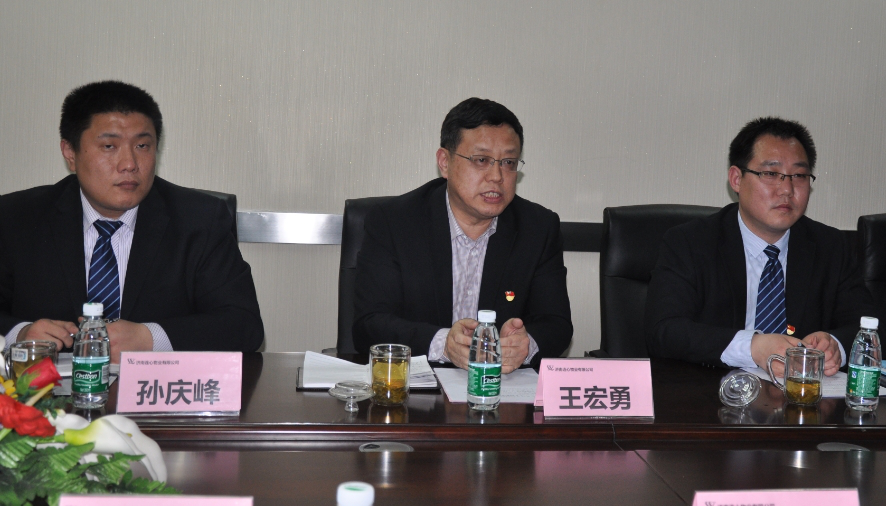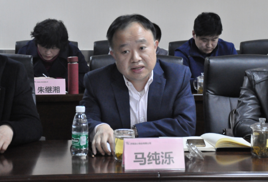 濟南連心物業(yè)有限公司總經(jīng)理王宏勇(中)與各位供應商代表進(jìn)行交流