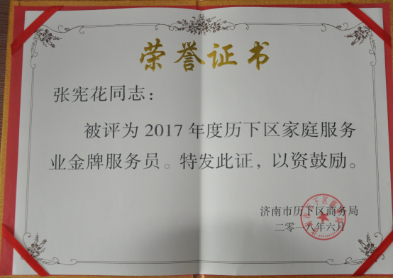 濟南連心物業(yè)有限公司員工張憲花榮獲2017年度歷下區家庭服務(wù)業(yè)金牌服務(wù)員