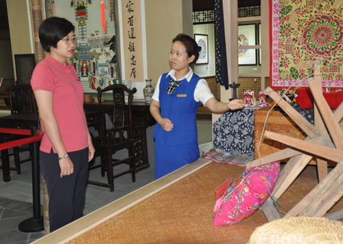 隨后,何國麗副主席一行參觀(guān)了山東省文化館的非物質(zhì)文化遺產(chǎn)展覽并聽(tīng)取了連心物業(yè)講解人員對非物質(zhì)文化遺產(chǎn)的詳細講解。何主席對連心物業(yè)在山東省文化館項目所提供的優(yōu)質(zhì)物業(yè)服務(wù)給予了充分的肯定,對連心物業(yè)講解人員的專(zhuān)業(yè)講解給予肯定和鼓勵。