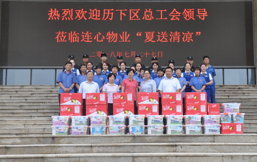 2018年7月27日上午9:30,歷下區總工會(huì )副主席何國麗、總工會(huì )組宣部部長(cháng)李偉及王健穎同志一行3人蒞臨濟南連心物業(yè)有限公司“夏送清涼”,送來(lái)了夏日的清涼與關(guān)心,送來(lái)了歷下區委、區政府、區總工會(huì )對我公司員工的關(guān)心與關(guān)愛(ài),為工作在酷暑炎熱的一線(xiàn)員工送來(lái)夏日的清涼與健康,讓辛勤工作在一線(xiàn)崗位上的連心員工過(guò)一個(gè)清涼的夏日。