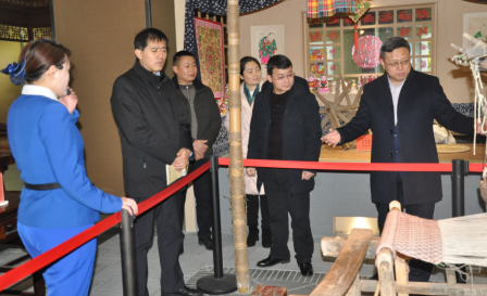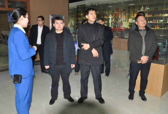 千佛山街道辦事處黨工委書(shū)記徐希陽(yáng)(左一)湖南永順縣靈溪鎮黨委書(shū)記向用坤(中間)一行參觀(guān)山東省文化館項目
