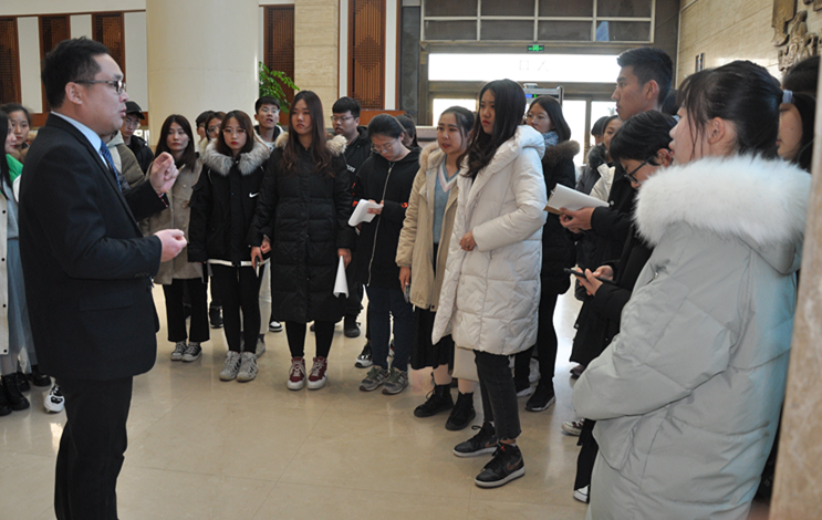 連心物業(yè)優(yōu)秀項目經(jīng)理李寶建給同學(xué)們講解大廳大型鍛銅浮雕壁畫(huà)