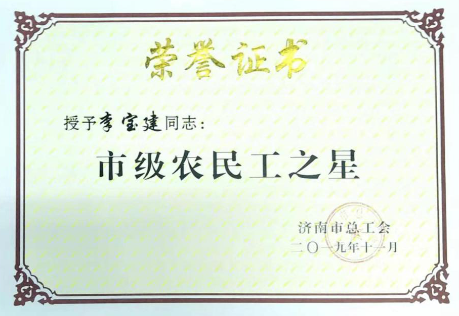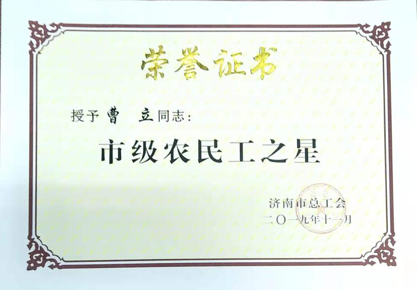 2019年12月25日,濟南連心物業(yè)有限公司被濟南市總工會(huì )授予“市級工友創(chuàng )業(yè)園”榮譽(yù)稱(chēng)號;公司副總經(jīng)理曹立,項目經(jīng)理李寶建被授予“市級農民工之星”榮譽(yù)稱(chēng)號。