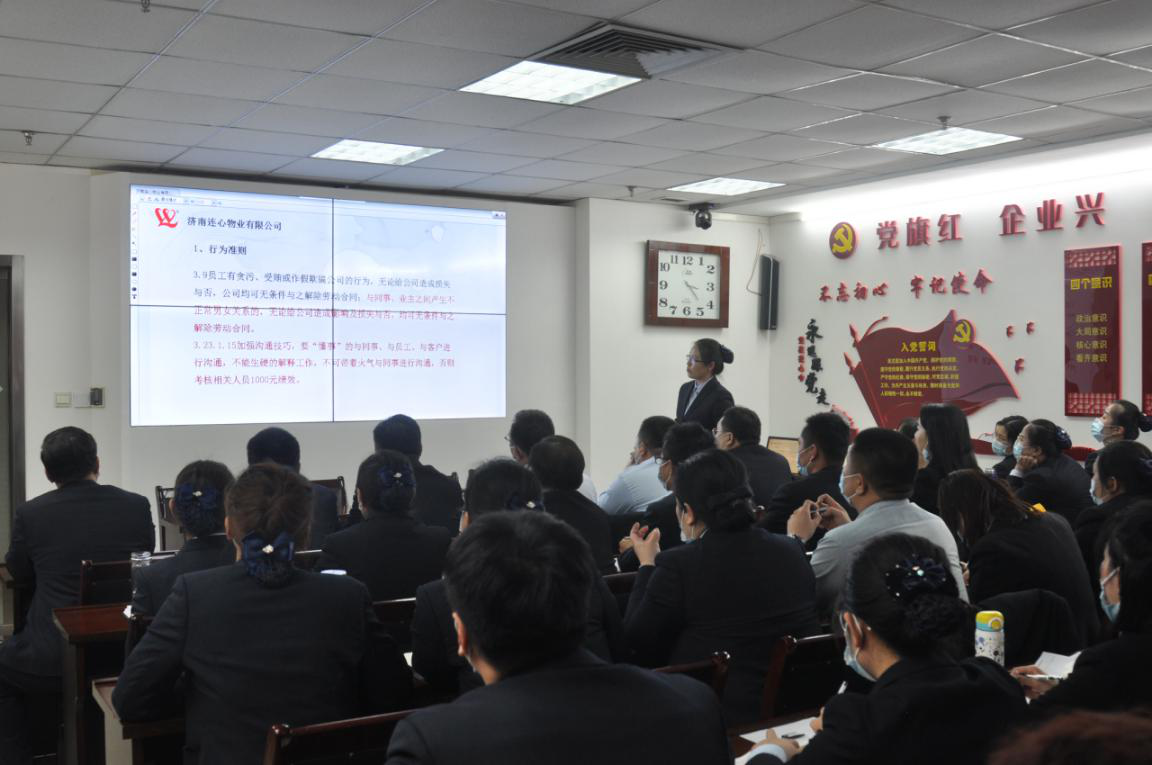 濟南連心物業(yè)有限公司辦公室主任劉亞楠就2021年公司規章制度修改部分做了詳細講解。自律即自由,公司規章制度的補充修訂不僅是規范員工行為,更是在日常工作中最大程度的保護員工權益,在日常工作中有章可循,有據可依,更好的為業(yè)主提供標準化的服務(wù)。