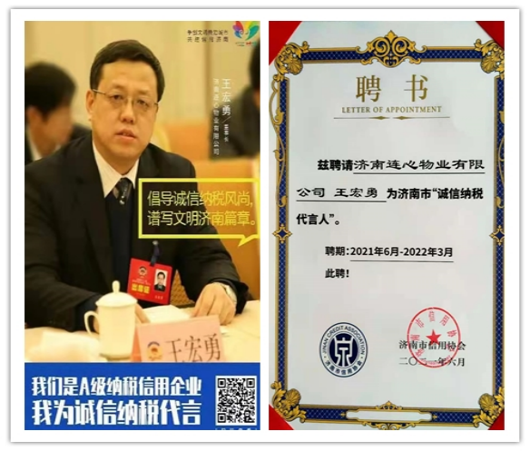 2021年6月25日,市信用協(xié)會(huì )、全國“信易貸”平臺濟南運營(yíng)中心聯(lián)合舉辦誠信納稅代言人聘任儀式暨“信用濟南·誠信納稅“主題宣講會(huì )。本次大會(huì )為濟南連心物業(yè)有限公司董事長(cháng)王宏勇等20位被評為“誠信納稅代言人”的人員頒發(fā)聘書(shū)并合影。
