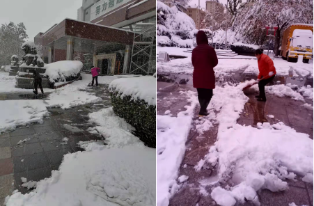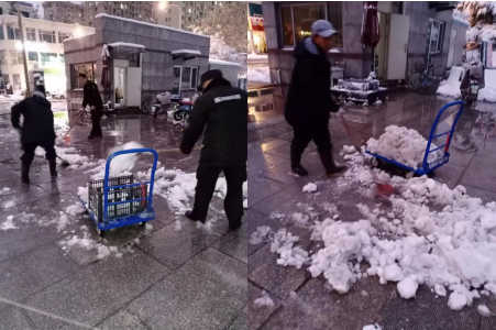 由于雪一直不停地下,剛剛掃過(guò)的路面又被覆蓋,大家只能反復清掃,沒(méi)有怠慢和埋怨?,F場(chǎng)掃雪工作人員的手和臉都凍得通紅,然而這一切絲毫沒(méi)有影響保障業(yè)主單位職工出行安全的真心與熱情,大家發(fā)揚吃苦耐勞、連續工作的“戰斗”精神,頂著(zhù)寒風(fēng),揮舞著(zhù)鐵鍬和推雪鏟,相互配合,你鏟我除,一點(diǎn)點(diǎn)地將積雪和冰層鏟起集中堆放,將積雪清掃干凈。