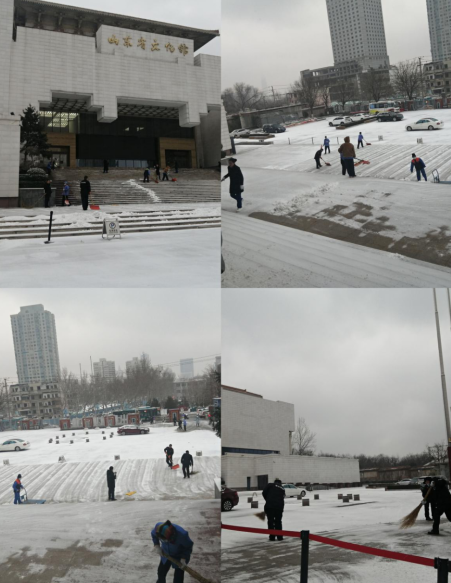 12月23日,又一輪的寒潮來(lái)襲我市,2021年第二場(chǎng)雪如期而至,24日一早,雖然雪還在下,風(fēng)也在刮,山東省文化館全體職工,自發(fā)的投入到緊張的掃雪鏟雪活動(dòng)中去,大家熱情不減,干勁不松,有的用掃帚掃雪,有的用鐵锨鏟雪,有的用獨輪車(chē)推雪,有的用平板車(chē)拉雪。在經(jīng)歷兩個(gè)多小時(shí)的緊張勞作,道路被清理完畢。特別是文化館門(mén)前的長(cháng)臺階,積雪清掃干凈后,還鋪設了防滑地毯,進(jìn)一步確保了游客安全。