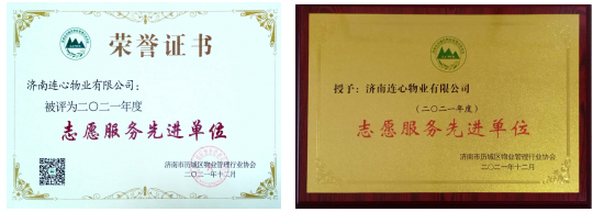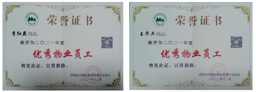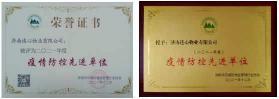 2021年12月,連心物業(yè)收到濟南市歷城區物業(yè)管理行業(yè)協(xié)會(huì )授予的多項榮譽(yù),濟南市歷城區物業(yè)管理行業(yè)協(xié)會(huì )“物業(yè)行業(yè)服務(wù)創(chuàng )新先進(jìn)單位”;“疫情防控先進(jìn)單位”;“志愿服務(wù)先進(jìn)單位”;王華衛、李紅燕被評為“優(yōu)秀物業(yè)員工”。