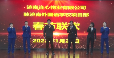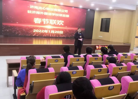 豪情歡歌辭舊歲,喜氣開(kāi)篇迎新年,2022年1月20日下午,濟南連心物業(yè)有限公司駐濟南外國語(yǔ)學(xué)校項目“穿上夢(mèng)想 共盼春來(lái)”主題春節聯(lián)歡在外國語(yǔ)學(xué)校報告廳舉行,濟南外國語(yǔ)學(xué)校校長(cháng)劉新利、黨委書(shū)記劉漢路、副校長(cháng)姜明、副校長(cháng)張紀余、校長(cháng)助理丁森、工會(huì )主席劉培虎、辦公室主任葛浩等領(lǐng)導應邀出席,公司副總經(jīng)理曹立及外國語(yǔ)學(xué)校項目部全體員工歡聚一堂、共度聯(lián)歡。