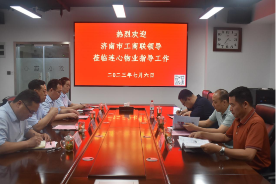 2023年7月6日下午,濟南市工商聯(lián)黨組成員、副主席黃慶濤,濟南市非公有制經(jīng)濟組織黨委辦公室主任李少俊,濟南市非公有制經(jīng)濟組織黨委辦公室副主任趙浩蒞臨濟南連心物業(yè)公司進(jìn)行工作調研。濟南連心物業(yè)有限公司黨支部書(shū)記、董事長(cháng)王宏勇,公司黨支部副書(shū)記、總經(jīng)理孟令乾,黨支部委員、工會(huì )主席李寶建,黨辦主任孫耀先參加本次調研接待工作。