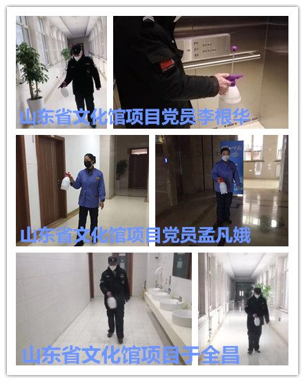 駐山東省文化館項目黨員李根華、孟凡娥、于全昌進(jìn)行館內防控消毒工作