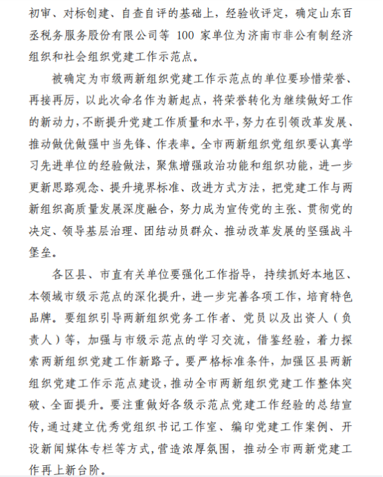 近日,中共濟南市委非公有制經(jīng)濟組織和社會(huì )組織工作委員會(huì )公布了“關(guān)于命名市級兩新組織黨建工作示范點(diǎn)的通知”,濟南連心物業(yè)有限公司被確定為“市級兩新組織黨建工作示范點(diǎn)”。